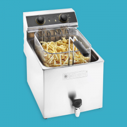 Fritadeira elétrica de bancada compacta, mas potente, com um tanque com capacidade de 8 l de óleo e produção de 13 kg/h.