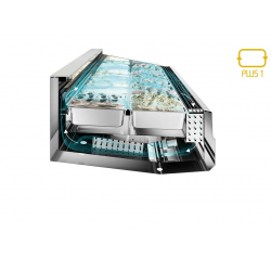 Evaporador duplo com fluxo traseiro de saída de ar único. As vitrines com ventilação PLUS 1 são equipadas com evaporador duplo e saída de ar traseira única, com fluxo do lado do operador para o lado do cliente. A única entrada de ar permite a configuração com uma única bandeja inclinada em 3 graus para a exibição de massas frias e porções individuais. Esta ventilação, graças ao alto lançamento de ar e defletores ajustáveis, é adequada para a apresentação de “montanhas de gelato”, mas também é perfeita para sorvete no palito.