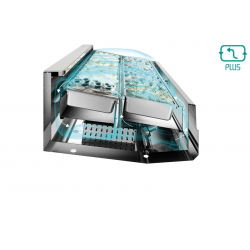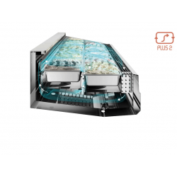 Evaporador duplo com fluxo traseiro de saída de ar duplo. As vitrines com ventilação PLUS 2 são equipadas com duplo evaporador e dupla saída de ar, traseira e central, com fluxo do lado do operador para o lado do cliente. A combinação do duplo evaporador e da dupla saída de ar garante a perfeita distribuição do frio em todas as bandejas. Este tipo de ventilação é adequado para a apresentação de “montanhas de gelato”, palitos de sorvete, porções individuais e massas frias.