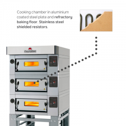 Fornos elétricos modulares para padaria e pastelaria de pizza. Disponível nas versões CLASSIC e STAND. Possibilidade de inserir o “vaporizador” em cada câmara de cozedura.