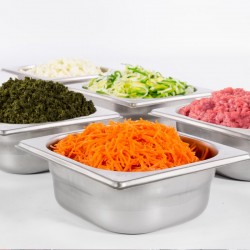 É composta por bloco de motor de velocidade variável, cabeçal universal e caldeiro cutter de 8 litros equipado com rotor com lâminas microdentadas.